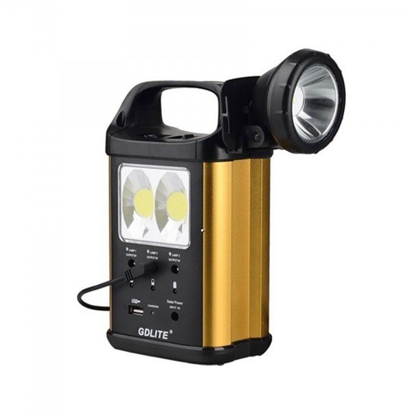 Kit Solar de Iluminat si Alimentare dispozitive la USB, cu Lanterna 2x COB LED 3W, trei Becuri cu LEDuri si lanterna detasabila 1 x COB LED 3W. Setul de incarcare solara include un acumulator de 6V 4Ah, cu incarcare de la Panoul Solar 9V 3.5W, sau de la 220V, model GDLite GD-8131