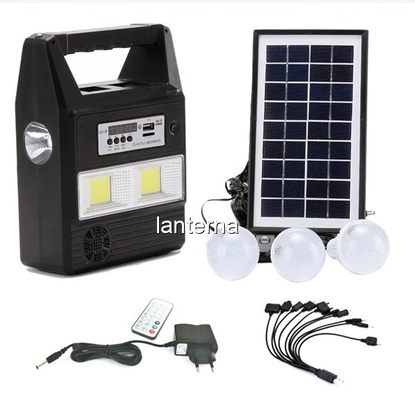 Kit Solar de Iluminat si Alimentare dispozitive la USB, cu Lanterna LED si trei Becuri cu LEDuri. Setul de incarcare solara include un acumulator de 6V 4Ah, cu incarcare de la Panoul Solar 9V 3-7W, sau de la 220V, model GD Plus GD-8216.