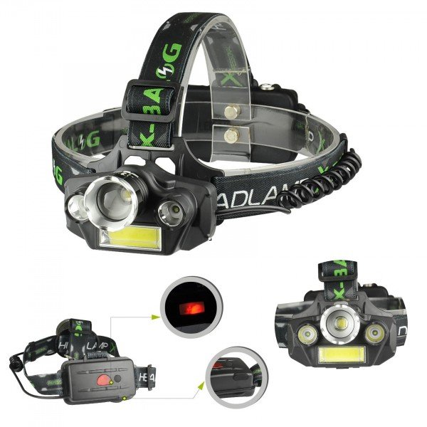 Lanterna Frontala 4 LEDuri putere 5W, 3 LED CREE si COB LED, cu Reglaj Focalizare Zoom si doi Acumulatori 18650. Lanterna de cap Reincarcabila la 12V 220V Xbalog BL-T45-T6 X-Balog.