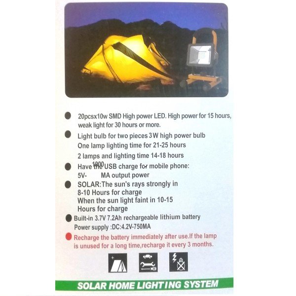 Sistemul cu incarcare solara pentru alimentare si iluminare este solutia ideala pentru situatiile in care nu dispuneti de energie electrica. Fie ca sunteti intr-o zona izolata, in camping sau in timpul unei pene de curent, kit-ul solar va ofera toate facilitatile de care aveti nevoie: iluminat portabil prin intermediul Proiectorului cu LED puternic de 10 W si a celor doua becuri cu LED-uri tip SMD.